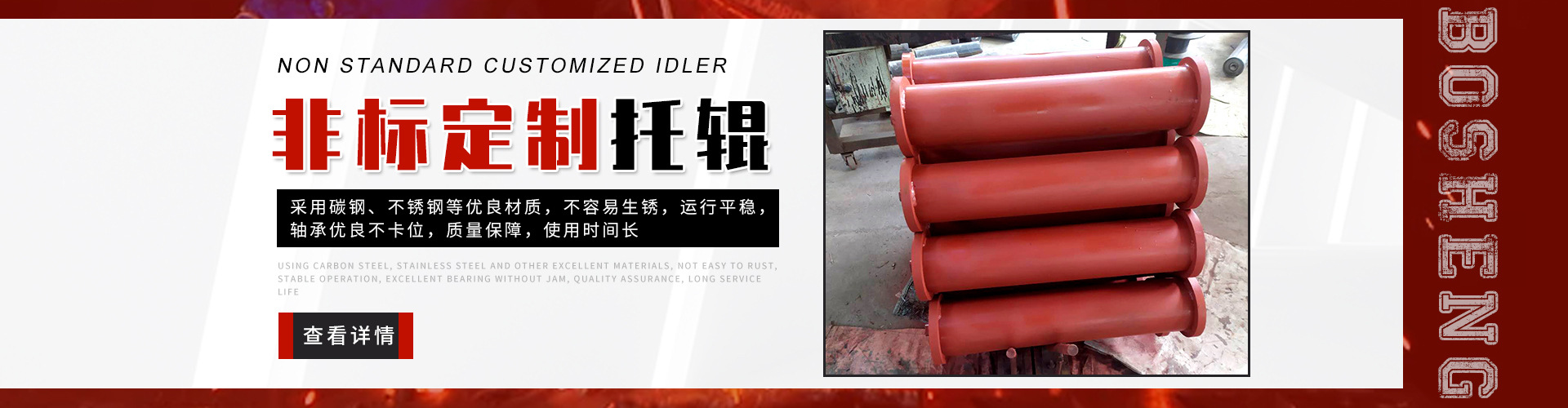 泰安博晟礦山機(jī)械有限公司位于山東泰安新泰市汶南鎮(zhèn)陳糧村。緊鄰京滬、京福、萊新高速公路。公路交通極為方便,環(huán)境優(yōu)美。公司主要生產(chǎn):托輥、托輥配件、托輥支架等皮帶輸送機(jī)配件。歡迎各界商友前來(lái)洽談考察。聯(lián)系電話(huà):13954880316. 泰安博晟礦山機(jī)械有限公司采用國(guó)際標(biāo)準(zhǔn)設(shè)計(jì)、制造技術(shù),將托輥的設(shè)計(jì)和制造提高到了一個(gè)更高的水平,生產(chǎn)的托輥具有小的旋轉(zhuǎn)阻力,長(zhǎng)的壽命,小的維修工作量和高的承載能力。鋼管采用托輥專(zhuān)用高頻焊管,管內(nèi)做去刺處理,圓度控制在特殊的公差范圍之內(nèi)。軸是按標(biāo)準(zhǔn)公差加工的冷拉鋼制造。軸承座采用進(jìn)口冷扎鋼板經(jīng)多次工藝沖壓而成。托輥管和軸承座被自動(dòng)焊接機(jī)械手焊接在一起,形成一個(gè)具有很高強(qiáng)度的整體構(gòu)造。托輥軸承采用國(guó)內(nèi)外知名品牌的大游隙深溝球雙密封軸承,使托輥具有理想的靜平衡和動(dòng)平衡,其旋轉(zhuǎn)阻力優(yōu)于國(guó)標(biāo)。托輥密封采用綜合國(guó)外和國(guó)內(nèi)迷宮式密封的特點(diǎn)進(jìn)行了專(zhuān)門(mén)設(shè)計(jì),內(nèi)充耐高速高溫和超低溫抗氧化鋰基酯,有效防止雜質(zhì)、水、空氣對(duì)托輥內(nèi)部的侵蝕。 目前我們托輥系列產(chǎn)品有槽形上調(diào)心托輥組、槽形托輥、槽形下調(diào)心托輥組、承載托輥、緩沖托輥、回程托輥組、螺旋托輥、摩擦上調(diào)心托輥組、平行緩沖托輥組、平行上調(diào)心托輥、礦用托輥、煤礦專(zhuān)用托輥、梳型托輥、樹(shù)脂托輥、陶瓷托輥、橡膠托輥、錐形托輥、立輥等。規(guī)格:直徑50-219mm;長(zhǎng)度190-2600mm。 泰安博晟礦山機(jī)械有限公司竭誠(chéng)愿與廣大客戶(hù)合作,共同發(fā)展開(kāi)發(fā)新技術(shù)新項(xiàng)目。泰安博晟礦山機(jī)械有限公司秉承